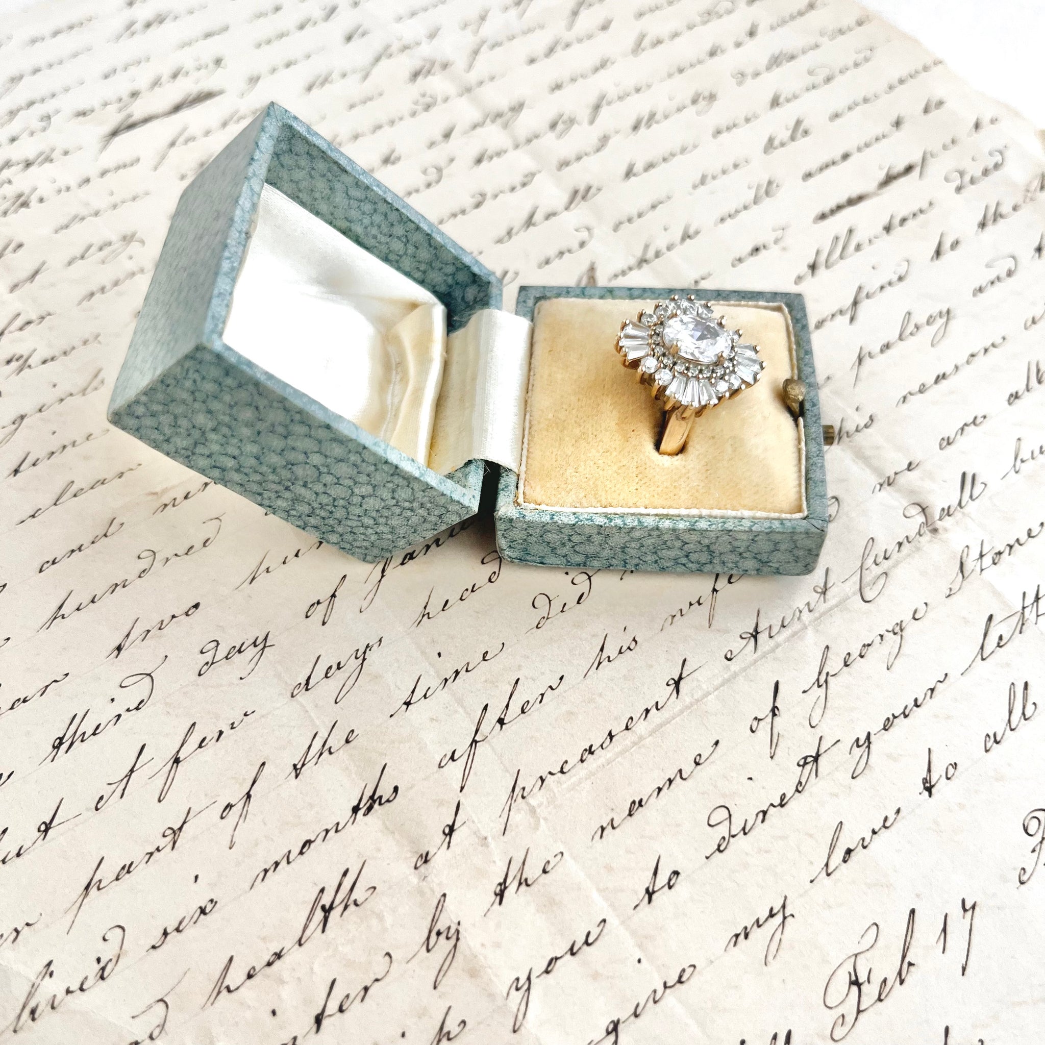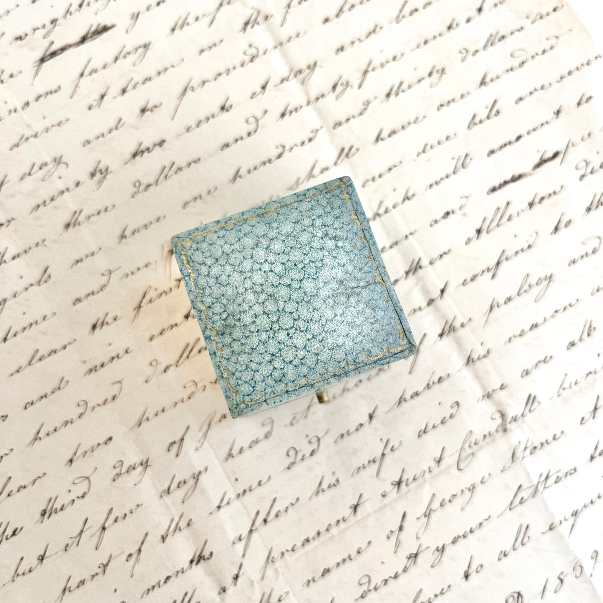 This elegant antique ring box features a classic square shape and a soft light blue exterior, offering timeless charm and understated romance. Its delicate color and refined form make it a beautiful choice for engagements, proposals, heirloom display or flat lays.