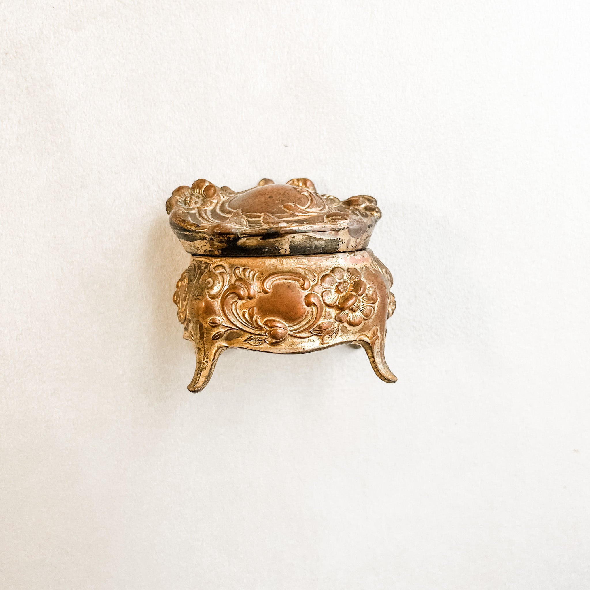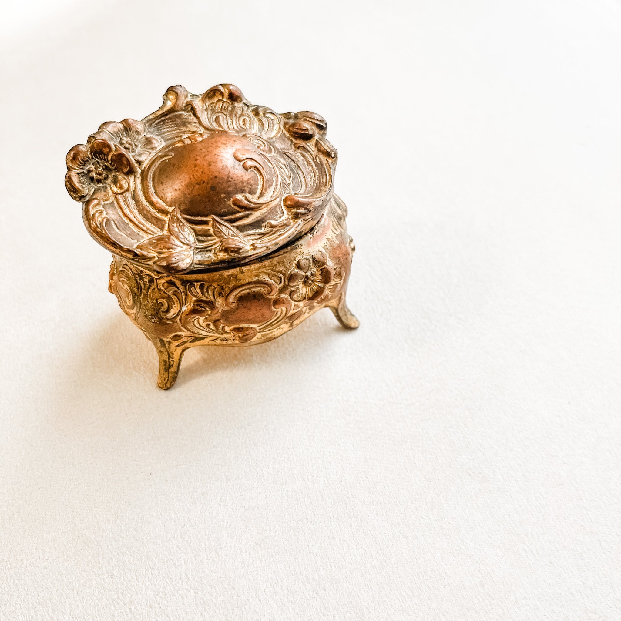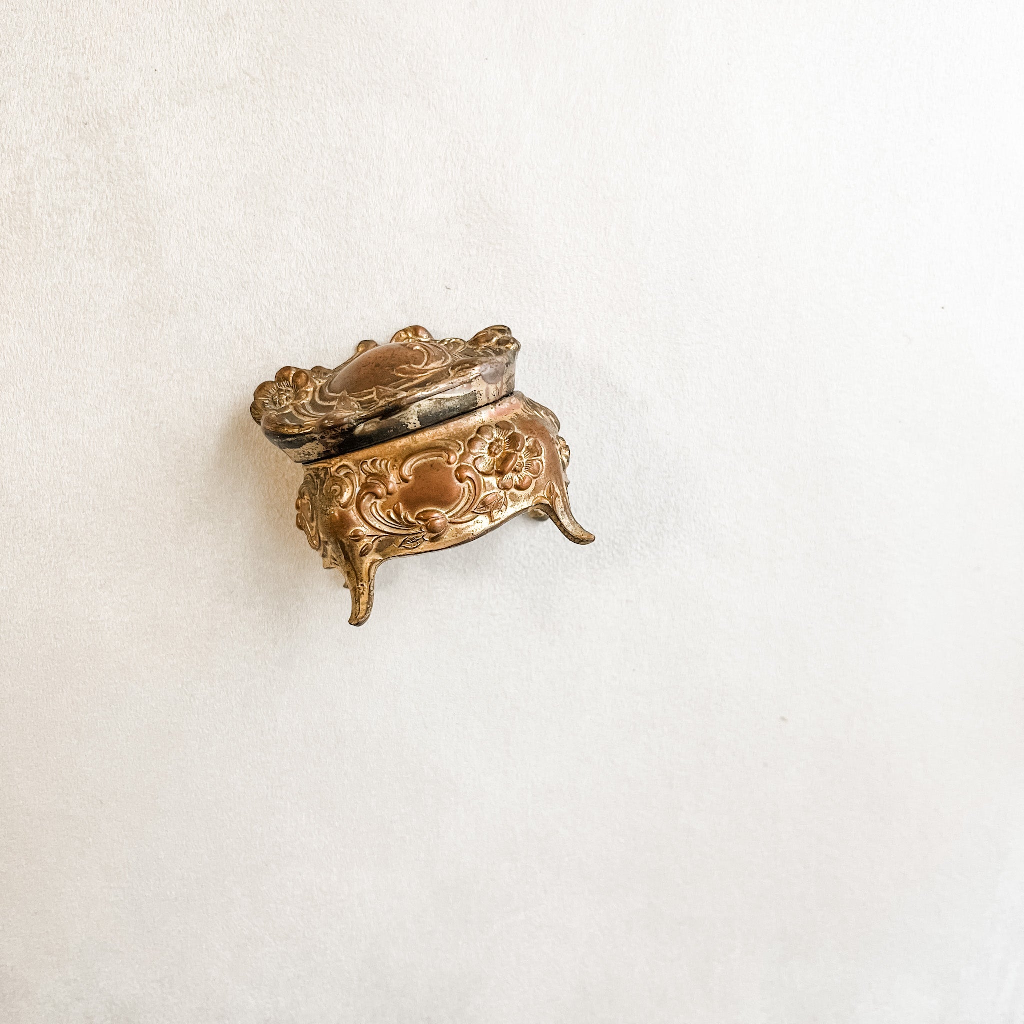 Beautiful antique jewelry "casket" box. Measures about 2.5"x 2". Perfect for displaying jewelry or fill with fabric and have a place to showcase wedding rings. The perfect addition to your flat lays.