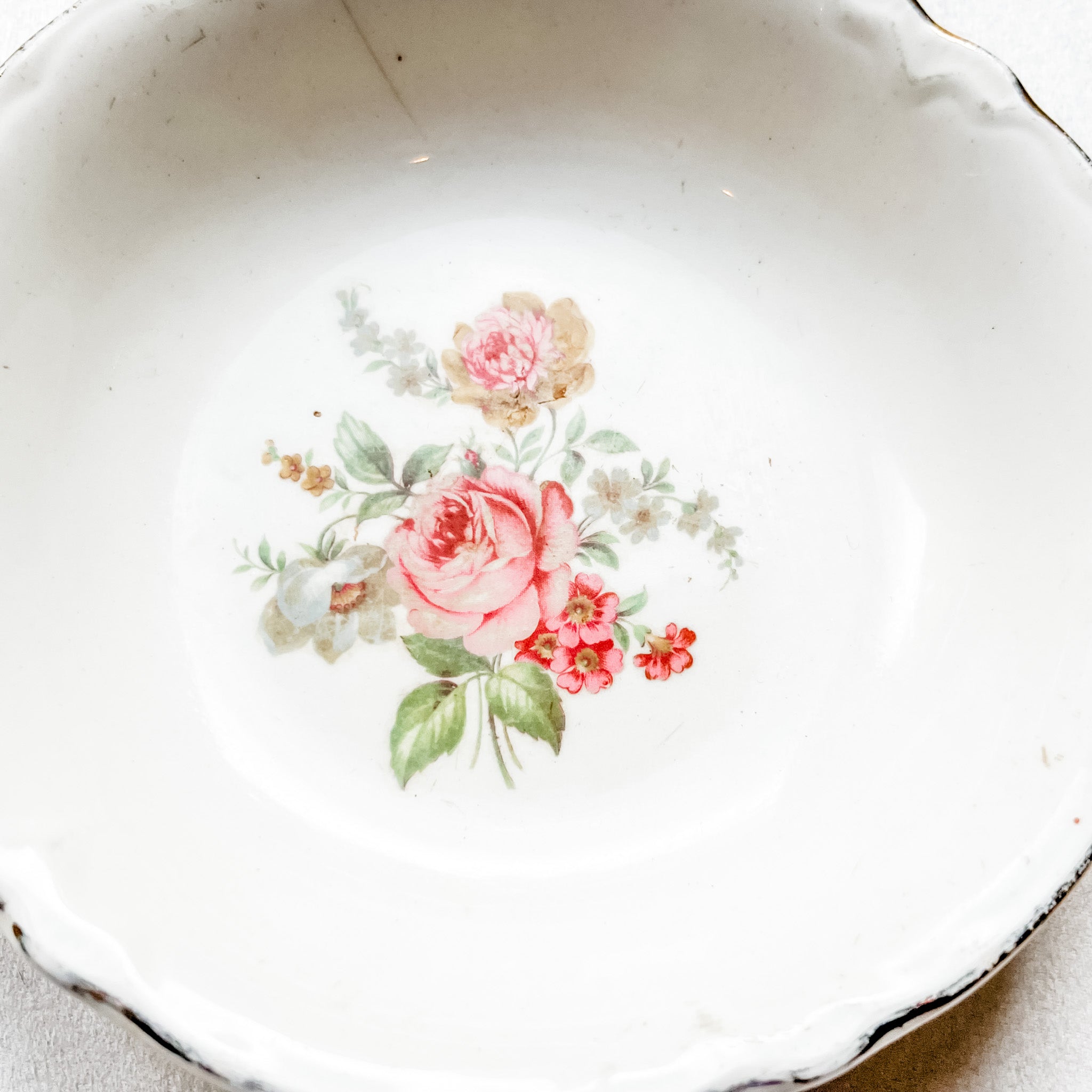 Beautiful floral vintage dish with a gold rim and the perfect dish to have in your styling kit. It's the perfect size to display rings, flowers, invitations and more. Measures 5".