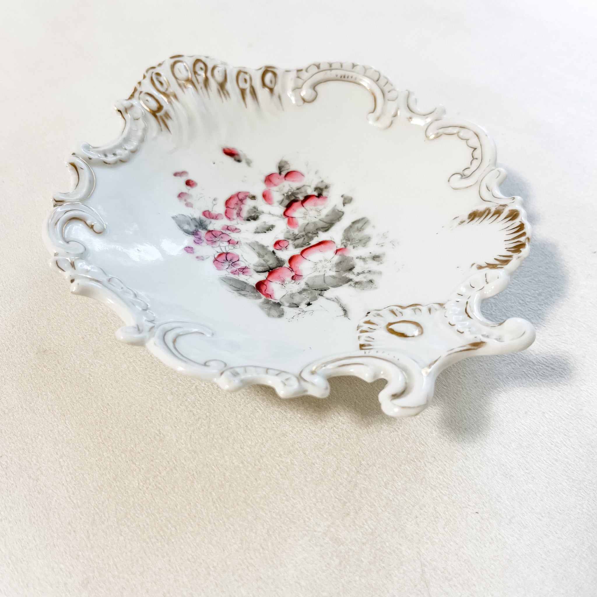 Gorgeous vintage ornate floral dish with a gold rim. Perfect for displaying weddings rings in their ring box, a perfume bottle or small note card in your flat lays. Measures 5"x6".